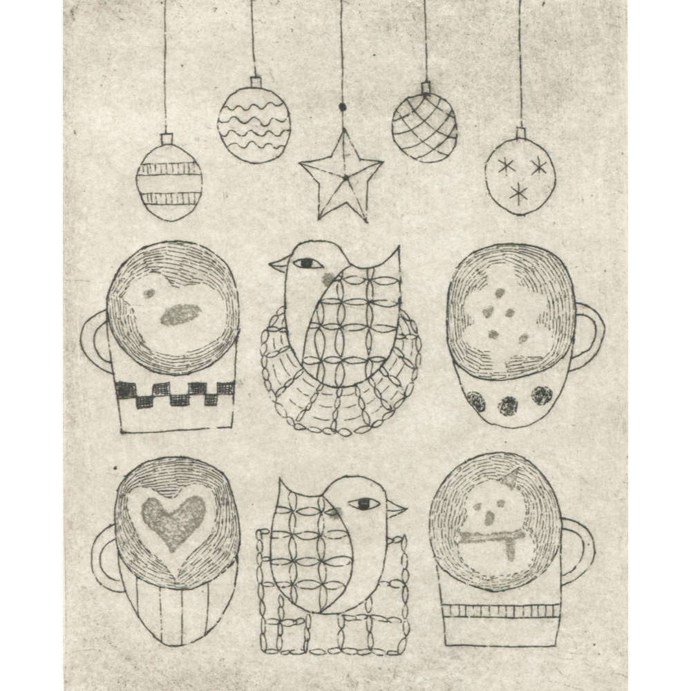 毎日元気な、小鳥さんの暮らしぶりを描いた紙版画作品です。 「beach」:海風そよそよ、砂浜でのんびりと